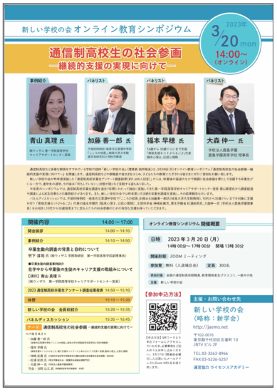 3/20「新しい学校の会 オンライン教育シンポジウム」のお知らせ 2023.02.23 お知らせ 3/20に「新しい学校の会 オンライン教育シンポジウム」が開催されます。 テーマは「通信制高校生の社会参画ー継続的な支援の実現に向けてー」 参加費無料。どなたでも参加可能。定員300名。 詳しくはチラシをご確認ください。 参加申込はチラシのQRコードから 下の画像の部分をクリック(タップ)すると、チラシが大きく表示されます。(PDF) 一覧に戻る