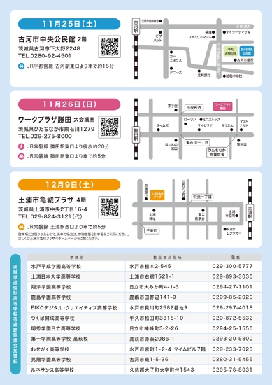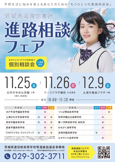 第2回進路相談フェアの実施について 2023.11.01 お知らせ 茨城県通信制高等学校等連絡協議会主催の第2回進路相談フェアを開催いたします。 進路選択でお悩みの中学生・高校生・保護者等の皆さま、ご来場をお待ちしております。 日時:令和5年11月26日(日) 10時00分~15時30分 会場:ワークプラザ勝田 (ひたちなか市) 〒312-0052 茨城県ひたちなか市東石川1279 日時:令和5年12月 9日(土) 10時00分~15時30分 会場:土浦市亀城プラザ (土浦市) 〒300-0043 茨城県土浦市中央2-16-4 一覧に戻る