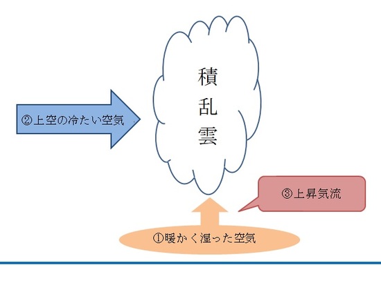 地面付近の暖かい空気が上昇し、上空で冷たい空気とぶつかり、