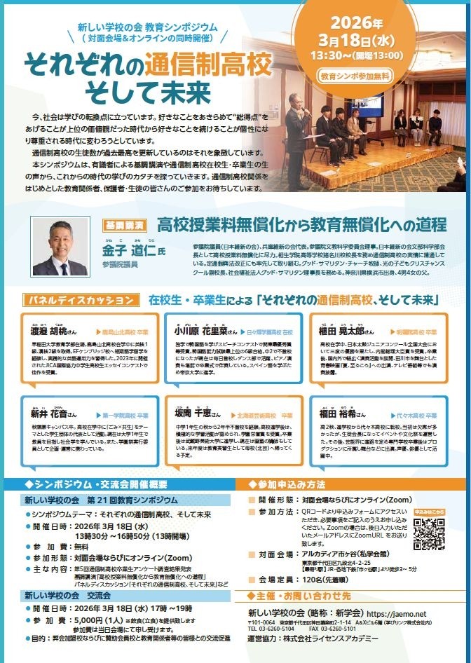 お知らせ新しい学校の会が3月18日に教育シンポジウム『それぞれの通信制高校 そして未来』開催します!