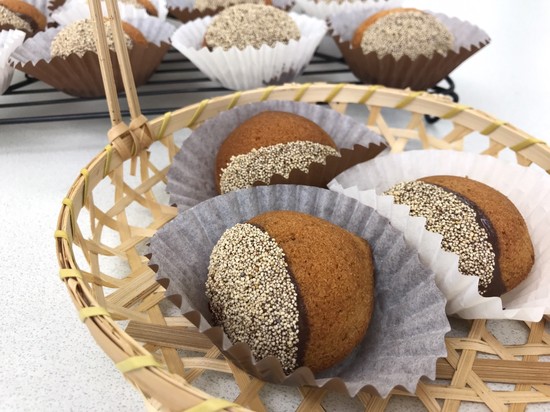 焼きあがったケーキに、チョコレートとけしの実をトッピングしたら
