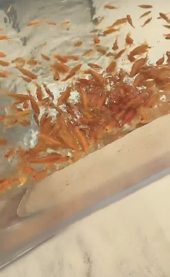 金魚の餌やりをしたら大量の金魚が寄ってきてびっくりしました。