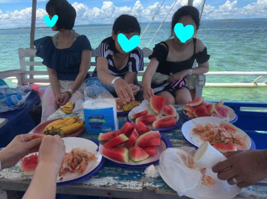 船上でエビのBBQ。フルーツがどっさり!!!現地では毎日マンゴーもどっさり食べてきたそうです!うらやましい!!