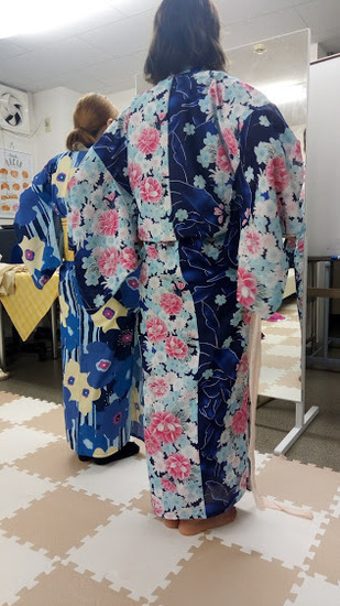 着る前の準備を教わり、手順を教わり、早速、各自、着付けていきます。裾の合わせや衿の抜き方など、