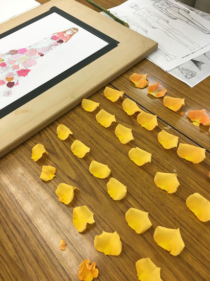 バラの花を分解して、花びらの付き方や、形や色の変化などを観察中。よく観察して気づいた花の美しさを、ファッションデザイン画に落とし込んでいます。