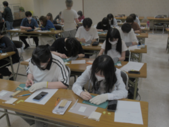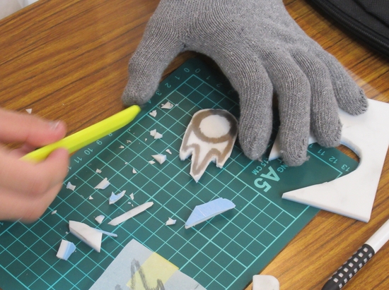 手袋をはめて彫刻刀やカッターを使い悪戦苦闘しながら作業に励む生徒たち。
