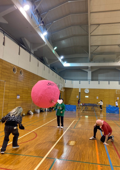 直径122cm・重さ1kgという巨大なボールを落とさないように力を合わせるゲームで、