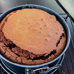 6月のお菓子作り同好会、作るものはガトーショコラです。理想的な焼き上がりは、綺麗にひびが入って、中央が凹んだ形です。さて、成功なるか!?