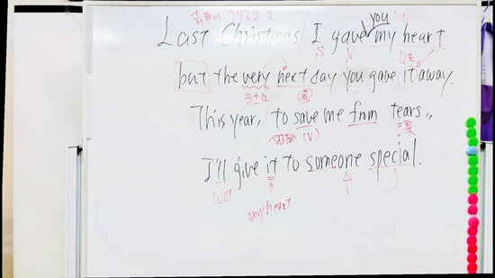 講義の中で、ワムの「ラストクリスマス」を引用し文法を学びました。先生の熱い歌声ステキでした!(生徒、かなりひいてましたが^^;)事務の先生は一緒に歌ってました♪(時代が同じ)