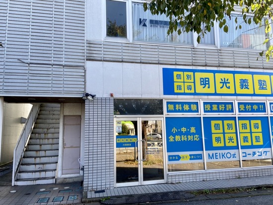 ここまで来ればもう着いたも同然。階段を上り外に出て左を見ると、明光義塾が見えてきます。