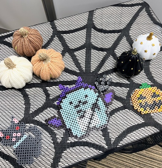 こまかなビーズを並べて、アイロンをあてて接着します。