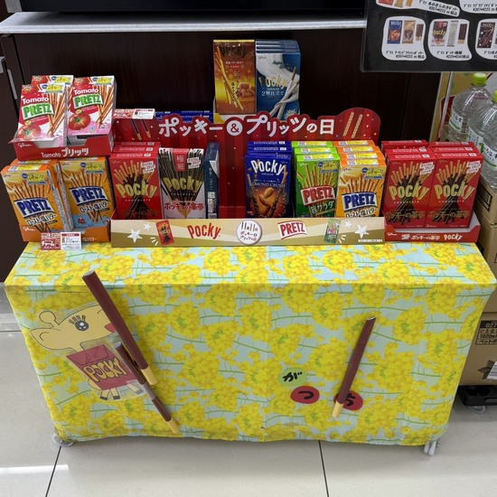 大津京駅前のコンビニでは、限定フレーバーや定番のものなど、たくさんの種類のポッキーが並んでいました。