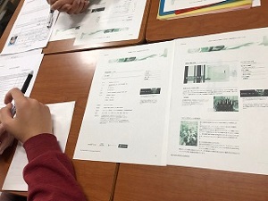 お話の後は、資本金、会社概要、沿革などを先生と一緒にお勉強。