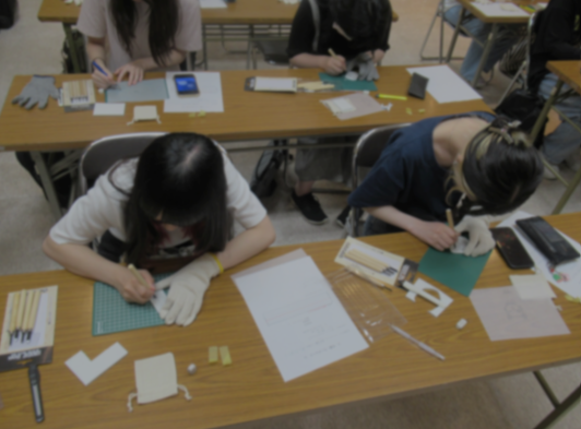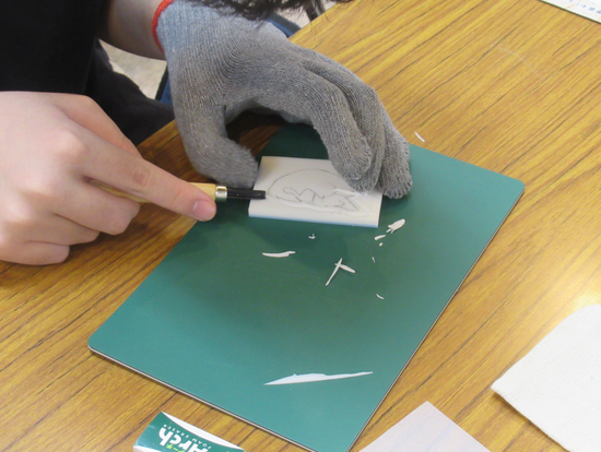 手袋をはめて彫刻刀やカッターを使い悪戦苦闘しながら作業に励む生徒たち。