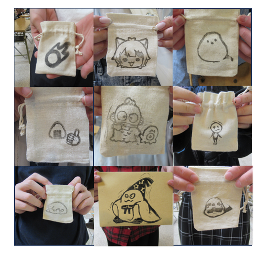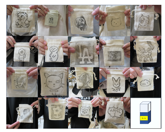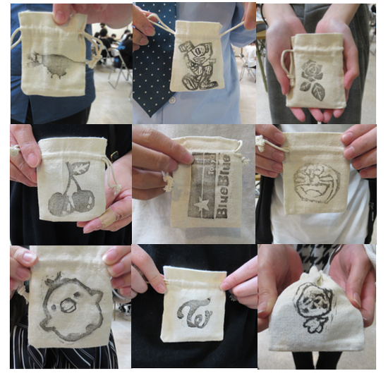 今回からは「作製した消しゴムハンコ」を「ミニ巾着袋の両面に押して」