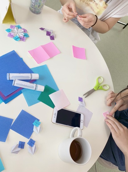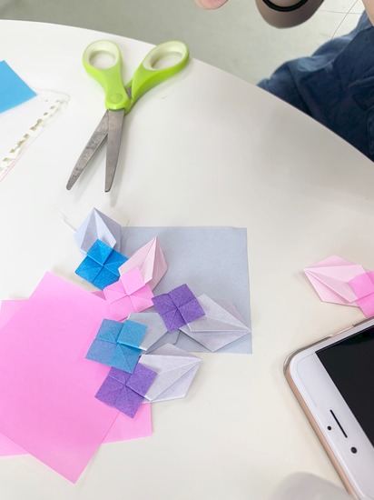 先日生徒と折り紙で紫陽花を作りました(*^-^*)